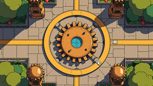 At the heart of the cyberpunk maze lies this magnificent mechanical core. The golden gear device pulses with blue energy, while four pathways extend like arteries through this living labyrinth. Small retro-tech buildings and vibrant greenery create striking contrast against the industrial backdrop.