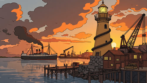 A retro-futuristic harbor where steam ships meet glowing tanks. Follow the neon clues hidden in cargo crates.